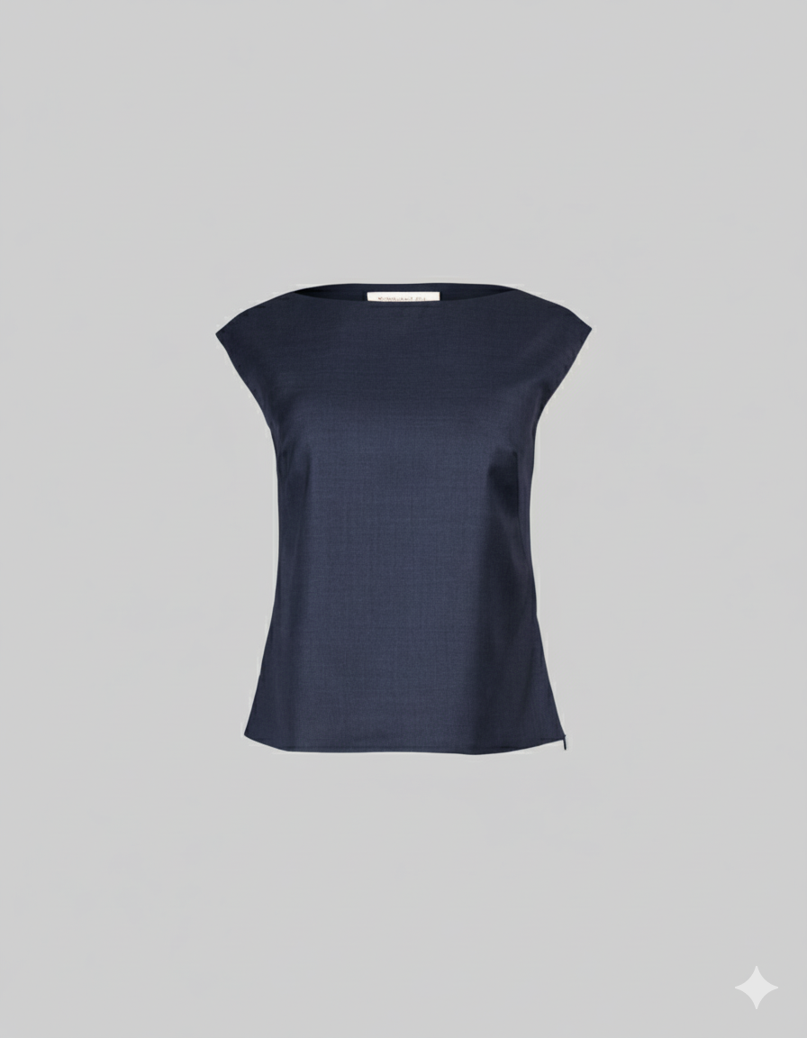 Our Navy wool is made in a weave that lends itself to mechanical stretch for added comfort and ease. The slight sheen elevates this classic color which works for multiple suiting uses from Blazers to Skirts to Pants, as well as our versatile Bateau Neck Top.