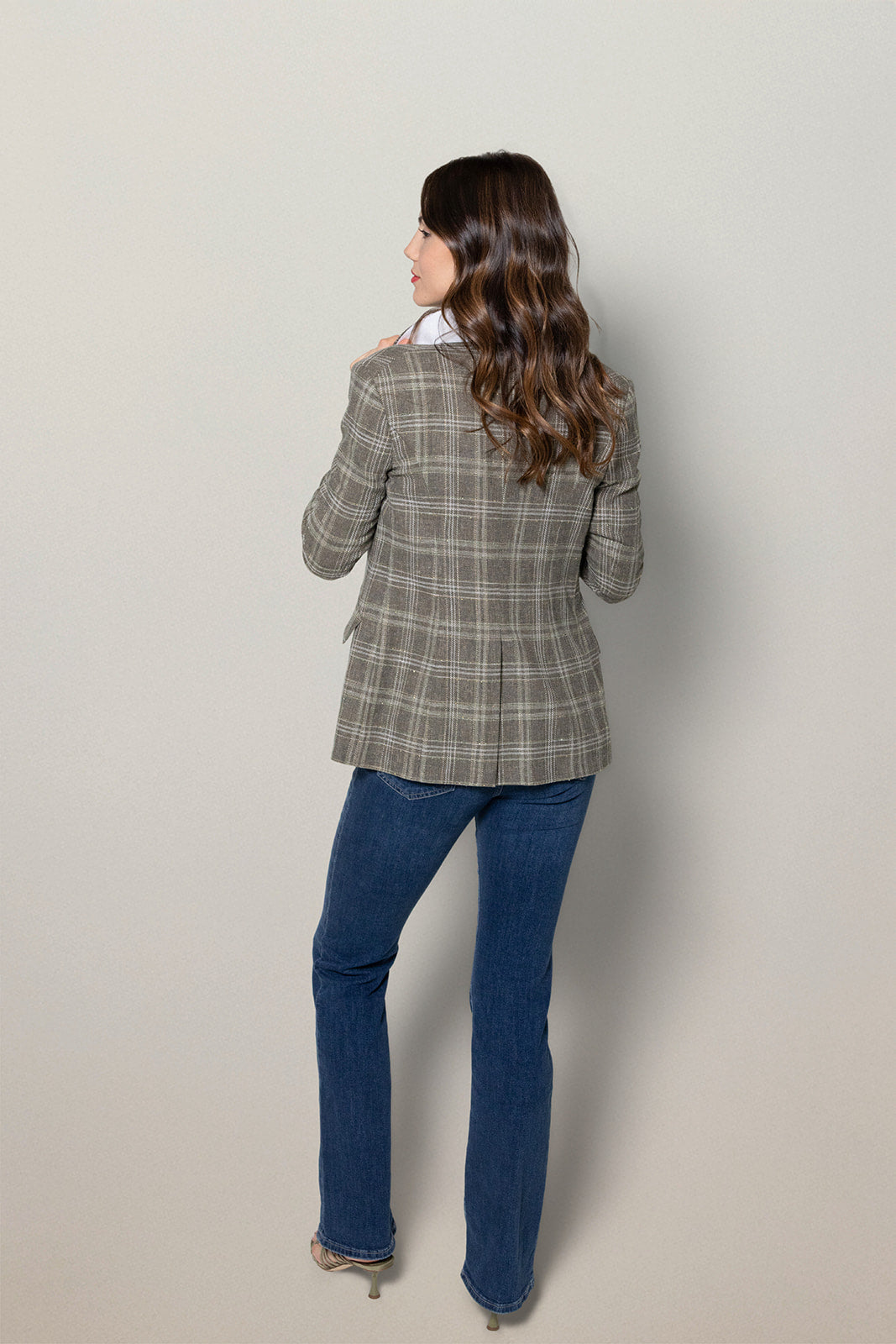 A grey‑olive and white tailored plaid inspired by filtered light and natural shade. Willowshade Plaid offers refined structure and understated elegance.
