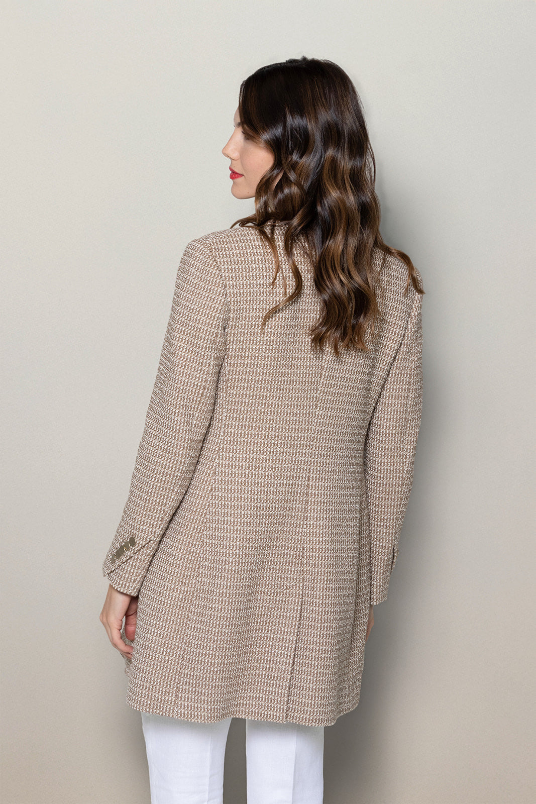 A honey‑and‑white cotton‑blend bouclé inspired by natural warmth and texture. Soft Umber Bouclé adds depth and softness to refined tailoring.